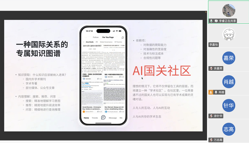 李睿探讨了如何将AI技术快速融入国际关系学术生活的主题,并进行了长期展望。他指出AI或许能够构建国际关系领域的垂直知识图谱,整合学术期刊、专著等资源,支持精准搜索、智能推荐与问答分析,建立融合人与AI互动的学术社区,推动学术成果的深度共享与对话,最终实现技术与学术研究的协同发展。