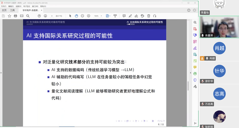 余嘉荣探讨了AI在国际关系研究中作为“研究对象”与“研究方法”的双重可能性。作为研究对象,AI在国际安全领域和国际政治经济领域有着较多新的研究进展。作为研究方法,AI可支持数据编码、文献分析,但其技术局限性要求人工验证与批判性介入,这也加速了研究者在AI时代重新锚定国际关系研究方向的进程。
