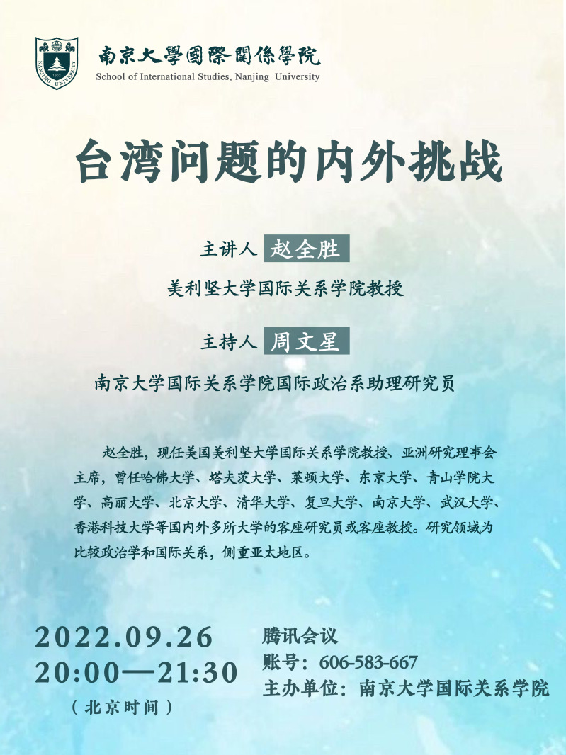 【讲座预告】赵全胜:台湾问题的内外挑战