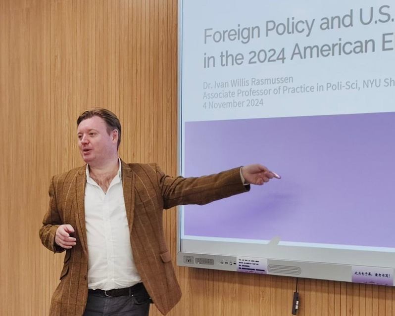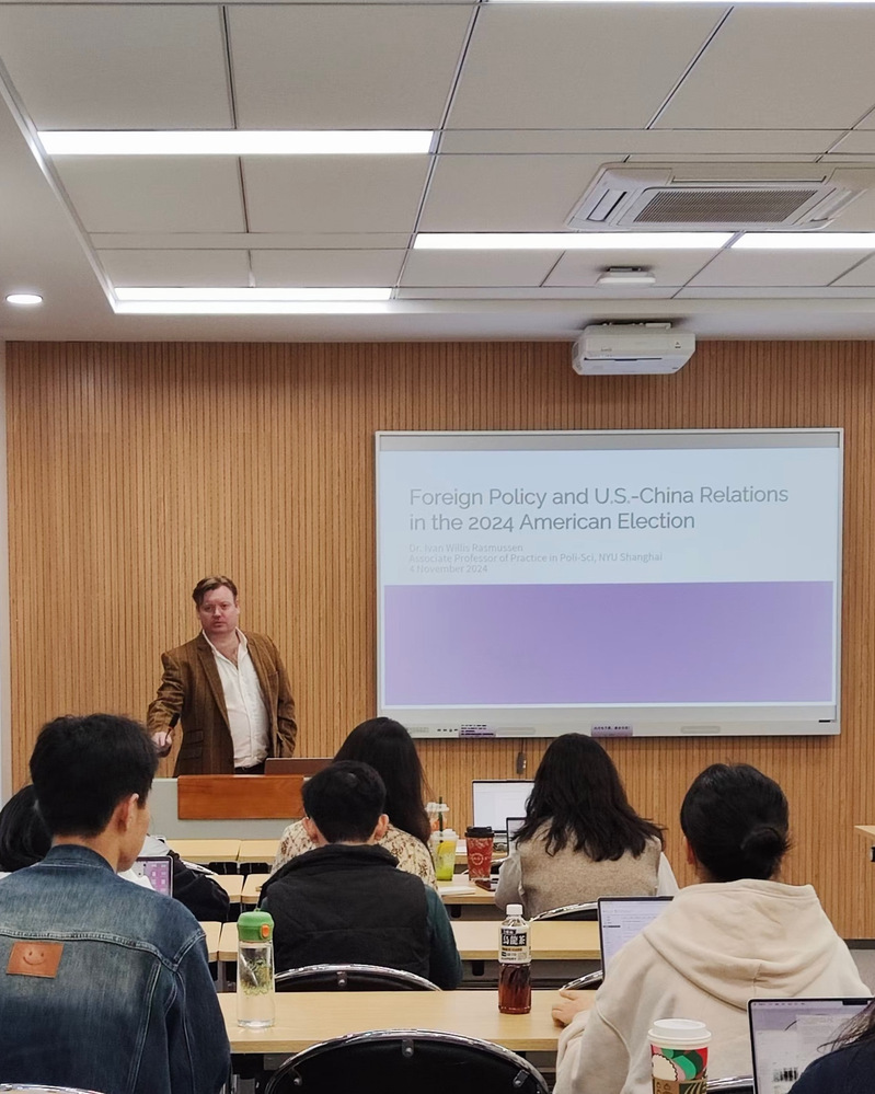 On November 4, 2024, Dr. Ivan Willis Rasmussen, Associate Professor of Practice in Political Science and Head of Undergraduate Study in Social Sciences at New York University-Shanghai, was invited to visit the School of International Studies to give a lecture on “Foreign Policy and China-US relations in the 2024 American Election”, which is the 8th “Advanced Lecture on World Politics” series. The lecture was hosted by Zhou Wenxing, Associate Professor of School of International Studies, Nanjing University. Over 20 students attended the lecture.